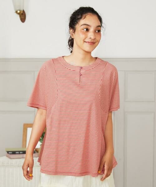 デイリー使いにもぴったりなカットソー。たっぷりとした身幅に、ドルマンスリーブ風の袖も相まって風通しの良いゆったりシルエットです。身頃のカーブ状の切り替えがスッキリ見えも叶えてくれるブラウスライクなひと品。前身頃にあしらったタックでふんわりとした女性らしい印象を後押します。二つ並んだ胸元のボタンと涙開きにも注目。