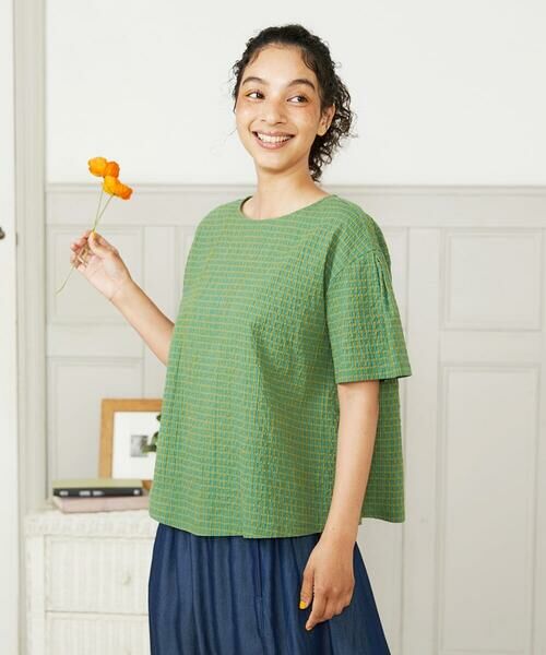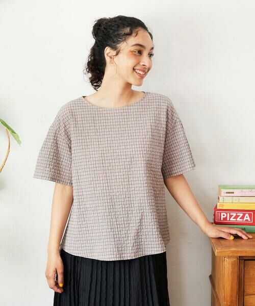 細かいチェック柄が目を惹くブラウス。夏場にも涼しく過ごせるリラクシーなシルエットです。すっきりとしたプルオーバーデザイン。タックを入れたフレアな袖は二の腕カバーも叶います。後ろの配色ボタンにも注目。