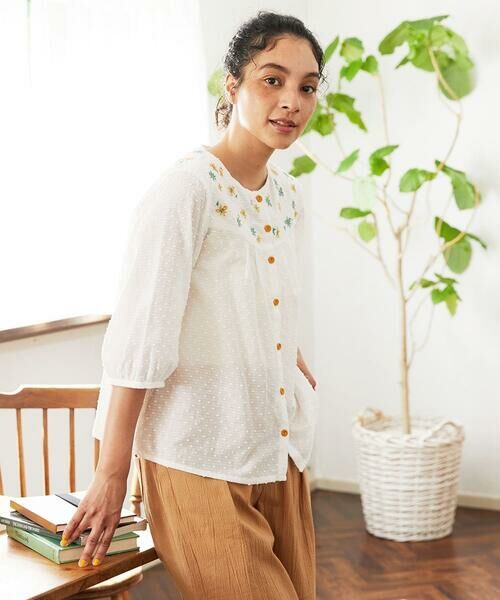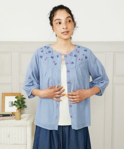 お花の刺繍がポイントのフェミニンなブラウス。前開きデザインなのでボタンを閉じてブラウスに、開けて羽織り風にも合わせていただけます。