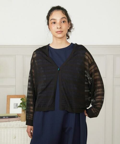シアー感のあるニット素材。混率や太さの違う同色糸で表現した透け感の異なるボーダー柄が魅力です。