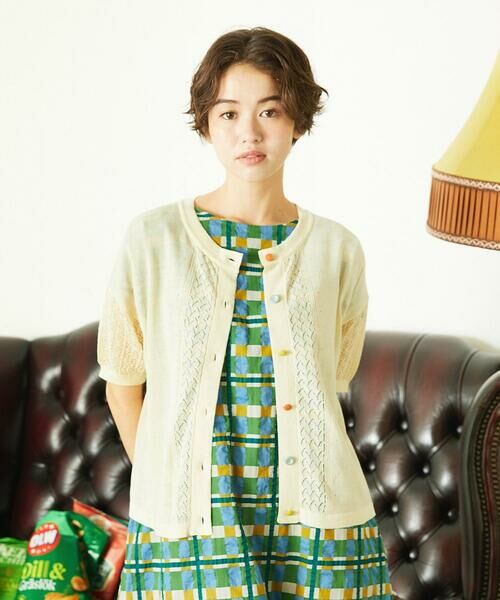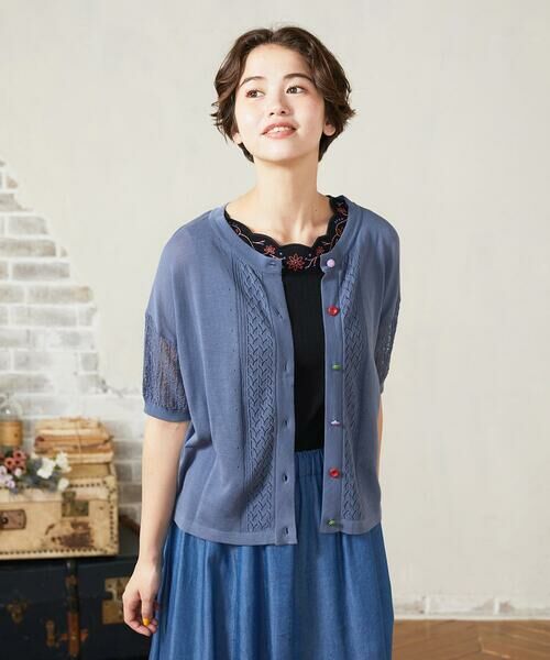シアー感が特徴のカーディガン。バランスの取りやすいボックスシルエットは着こなしの幅が広いのが魅力です。袖と前中心の部分は柄編みを施した繊細なデザイン。ドロップショルダーでこなれた雰囲気を演出します。本体のカラーに合わせたデザイン違いの配色ボタンにも注目。