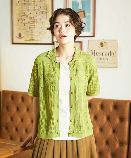 軽やかな着心地がうれしい暑い時期にピッタリのカーディガン。風通しも良く、快適にお召しいただけるゆったりシルエット。上下で編み柄を変え、襟付きデザインがこだわりのポイントです。配色感がホコモモラらしいボタンが全体のアクセントに。前開きデザインなので夏の羽織りにもオススメです。