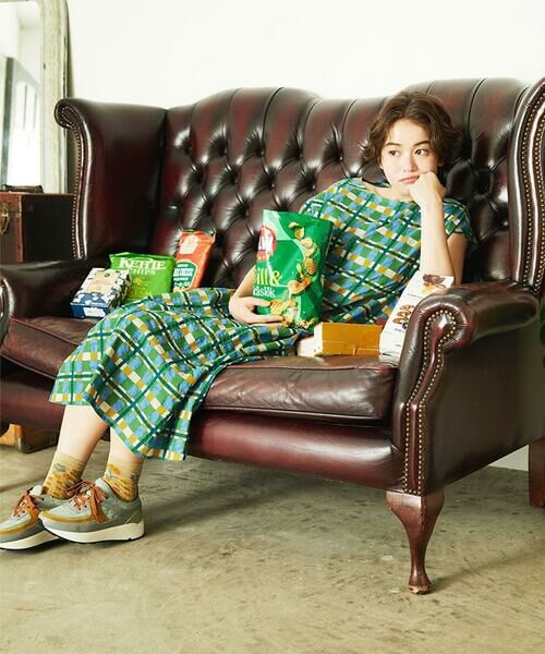 配色感にこだわったチェックワンピース。一枚でも勿論、カーディガンや無地のブラウスをレイヤードして冷房対策にも。ホコモモラのデニムレギンスとのコーディネートもオススメです。