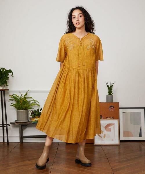 インド製ならではの軽やかでシアー感のあるワンピース。身幅を多めにとり、涼しくゆったりとしたシルエットです。胸元と背中に施されたお花のコード刺繍はデザインのポイント。腰回りのギャザーが女性らしい印象を後押しします。胸元の三つボタンと飾り紐もアクセントに。アンダードレス付き。風通しの良いワンピースは夏場に活躍すること間違いなしです。