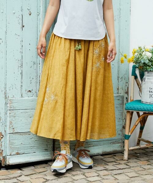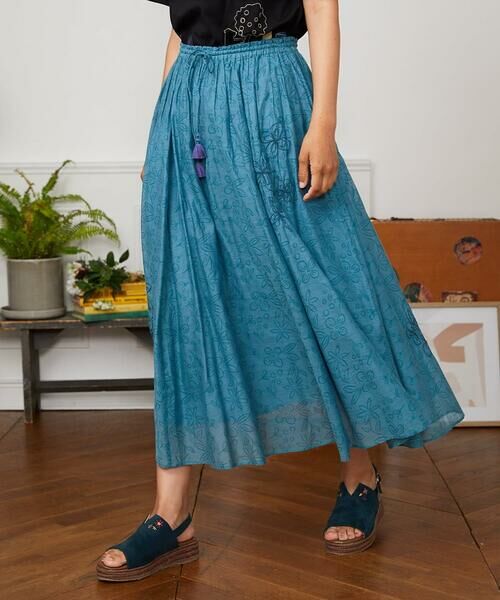 インド製ならではの軽やかでシアー感のあるスカート。女性らしい印象を叶えるふんわりシルエットです。前後三ヶ所に施したお花のコード刺繍がデザインポイント。ウエストはオールゴム仕様でリラクシーな着用感ながらも、ギャザーでフェミニンな印象を後押しします。さらっとした素材感のスカートは夏場も快適にお召しいただけます。