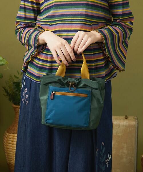 カジュアルなポリエステル素材のミニトートバッグ。ハンドルや外ポケットのホコモモラらしい配色切り替えがアクセント使いにもぴったりのひと品です。表のポケットにはファスナー付きの大きめポケットが魅力に。マグネットボタンの間口はドロストコード付きで絞りアレンジが出来るのも嬉しいポイント。ミニトートバッグとしてはもちろん、ショルダーベルト付きで使い勝手が良く、普段のお出かけからレジャーまで幅広く合わせていただけるアイテムです。