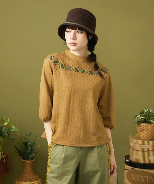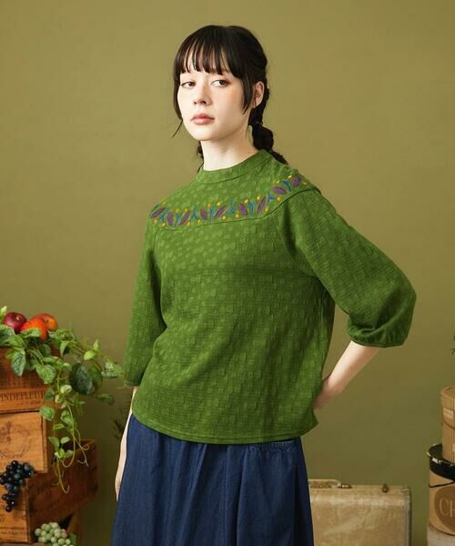 浮き出た雲のような柄が特徴的なプルオーバーカットソー。ゆったりとしたシルエットでリラクシーな着用感です。ロングシーズン活躍してくれる半端袖。首がキレイに見えるハイネックと、ヨーク部分に一周に施された葉っぱの刺繍が顔周りを華やかな印象に。後開きの3つの配色ボタンにも注目です。こだわりが詰まった一枚でサマになるデザインカットソーはマストハブアイテムです。