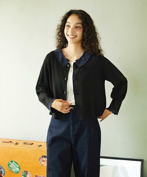 大人かわいいカーディガン。ややコンパクトな丈感と羽織りにも重宝するゆとりあるシルエットです。淵がレース編みの配色の襟がデザインポイント。袖口にも配色のレース編みを施しました。刺繍くるみボタンを使用し、細部にまでこだわったひと品。上品ながらもホコモモラらしいカーディガンです。