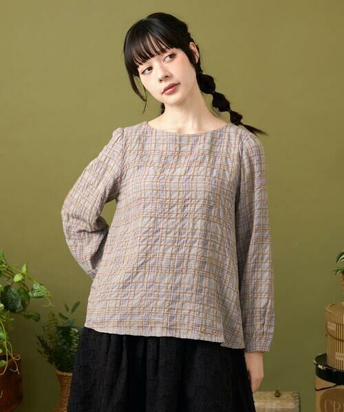 二種類の太さのチェックが特徴的なブラウス。ふんわりとしたシルエットで快適な着心地を実現します。セットインスリーブで羽織りやすく、袖山のギャザーと袖口のダーツで袖をふんわりさせ大人かわいい印象に。後ろの涙開きボタンにも注目です。