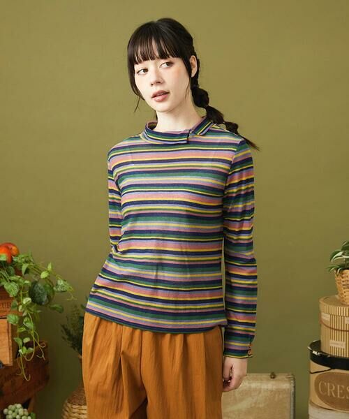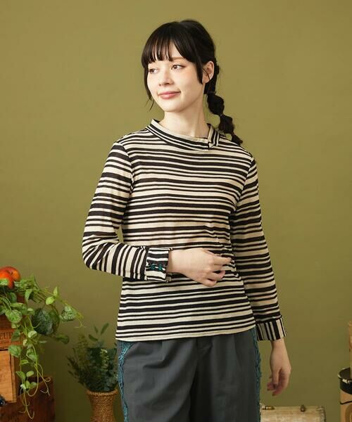ランダムボーダーが目を惹くカットソー。伸縮性のある素材も相まってほどよく体にフィットし、インナーにぴったりなすっきりシルエットです。首元は折り返した襟のデザインが特徴。袖はやや長めのお仕立てで、袖口には両面にボタンをあしらいました。そのままではもちろん、カフスを折り返して異なった配色や柄の違いが楽しめるひと品。季節の変わり目に重宝するアイテムです。