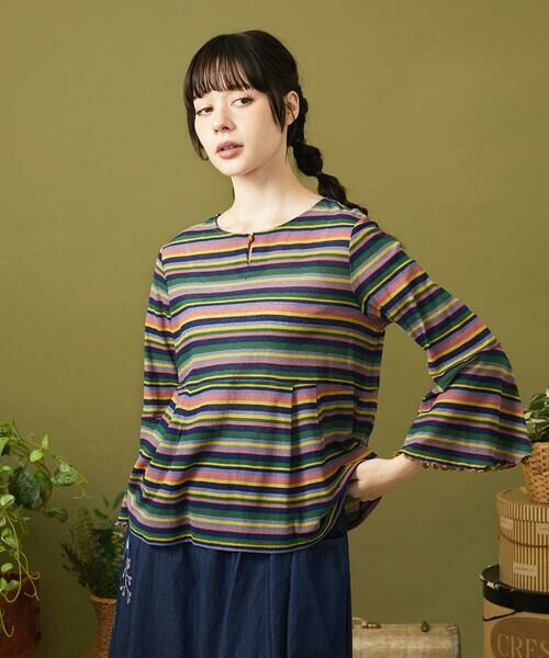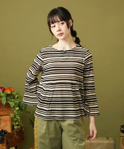 ランダムボーダーが目を惹くカットソー。ウエストに切り替えとタックを施した女性らしいシルエットです。首元はすっきりとしたクルーネックに涙開きを施しました。フレアになった袖がデザインポイントで、袖の切り替え部分と袖先のメロウにも注目。季節の変わり目に重宝するアイテムです。