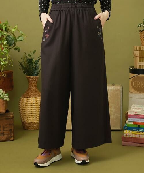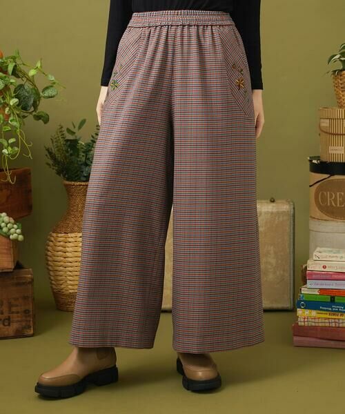 レトロな雰囲気のイージーパンツ。足さばきの良いワイドシルエットです。ウエストはオールゴムと内側に紐を通し、お好みのサイズに調整が可能。リラックス感がありながらもすっきり見えを叶えます。前後には嬉しいポケット付き。前のポケット口にあしらった配色刺繍にも注目。