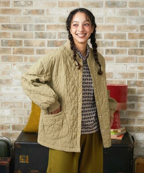 お花ステッチがかわいいキルティングアウター。ゆったりした身幅とドロップショルダーが快適な着用感を叶えます。お尻にかかるやや長めの着丈も嬉しいポイント。襟元と袖口はリブ、配色のスナップボタンでカジュアルな印象ながらも、お花ステッチでかわいさをプラスしたホコモモラならではのひと品です。