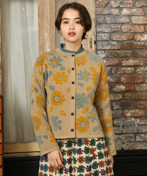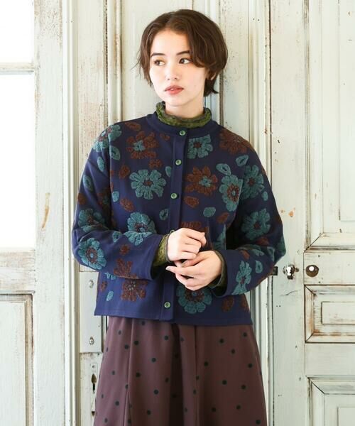 ホコモモラらしいお花をあしらったニットカーディガン。テーマの「帝国通り」からインスピレーションを受けています。バランス感の良いボックスシルエットで体のラインを拾いにくいのも嬉しいポイント。ドロップショルダーで快適な着用感を実現します。袋ジャカードで表現した大きめの配色フラワーモチーフが華やかで女性らしい印象を後押し。配色ボタンにも注目。コーディネートの主役になってくれるカーディガンは今季イチオシのアイテムです。