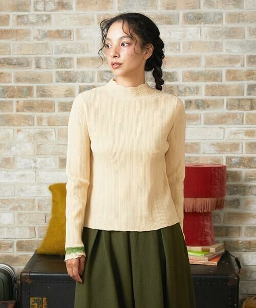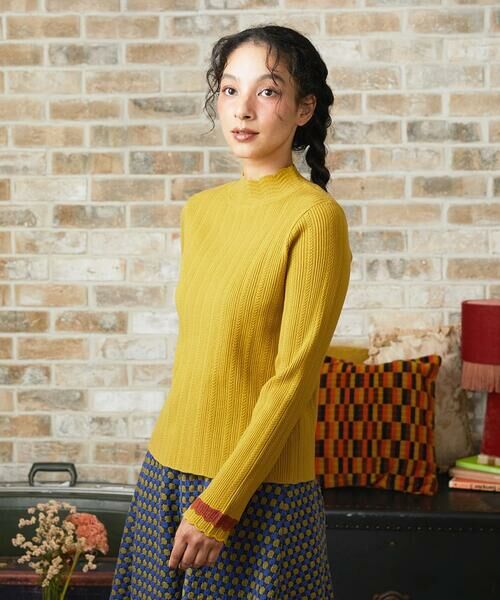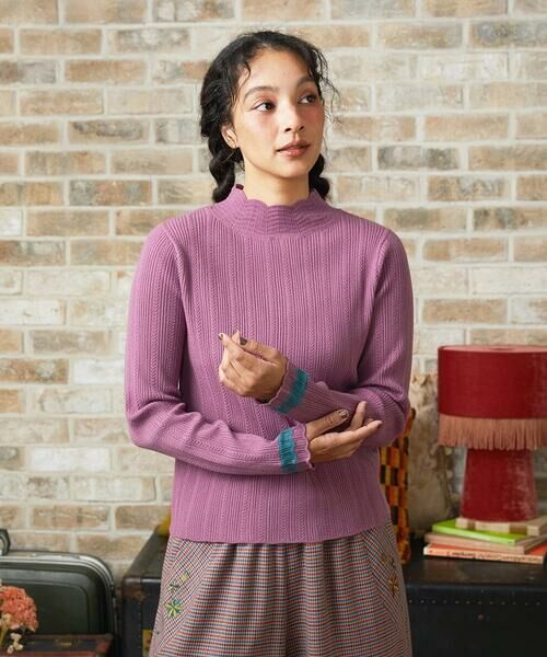 袖口の配色カラーが目を惹くハイネックリブニット。ほどよいフィット感のあるすっきりしたシルエットです。ハイネックデザインで一枚着としてはもちろん、レイヤードのインナー使いにもおすすめ。変形リブ編みも他と差のつくポイントに。襟と袖口の透かし編み、スカラップがデザインにも注目です。