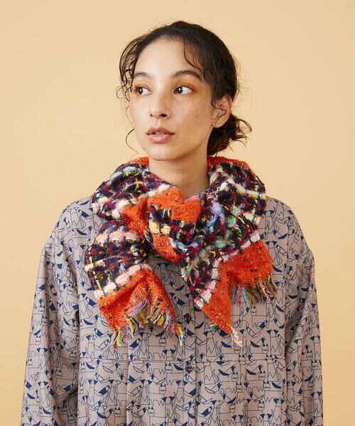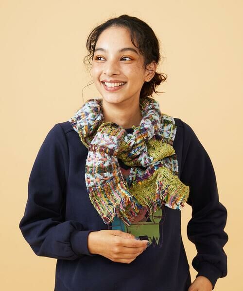 ネップヤーンやラメ糸を組み合わせたアートフルな仕立てが魅力のデザインマフラー。素材や太さも異なるMIXディテールがユーニークで存在感のあるひと品です。センターラインにシャーリングゴムを施したギャザーフリルがおしゃれなアクセント。さっと首元に巻くだけで華やかな印象をプラスし、コンパクトで扱いやすいのも嬉しいポイントです。