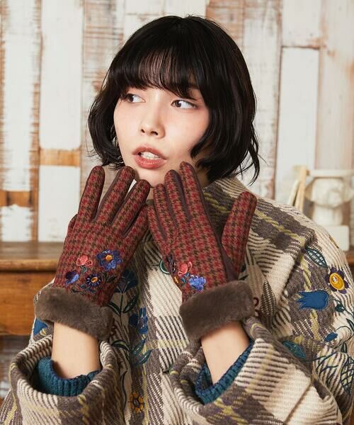 暖かなカラーの千鳥格子柄がトラッドな雰囲気を演出するグローブ。入れ口にはふんわりとしたフェイクファー素材をあしらい、デザイン性と防寒性を兼ねたデイリーユースにぴったりなひと品です。シックな色合いのフラワー刺繍がシーズナルなアクセントをプラス。シンプルなスタイリングのアクセントとしても活躍するおすすめのアイテムです。