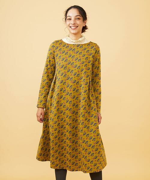 気負わずにおしゃれを楽しめるカットソーワンピース。裾に向かって広がるAラインシルエットです。サイドにタックを施しゆとりを持たせながらも、セットインスリーブがダボつきすぎないきれいなシルエットを叶えます。ぽこぽこした葉っぱ×お花が規則的に並んだ柄は他とかぶらないホコモモラらしいデザインに。配色感が大人かわいいひと品です。