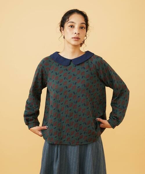配色のフラットカラーがかわいいカットソー。一枚でもサマになるプルオーバーデザインで、ゆったりした身頃とラグランスリーブが快適な着用感を叶えます。袖口のタックで袖のシルエットに丸みを持たせ、女性らしい印象をプラス。ぽこぽこした葉っぱ×お花が規則的に並んだ柄は他とかぶらないホコモモラらしいデザインに。すっきりとしながらも配色感が魅力の大人かわいいひと品です。