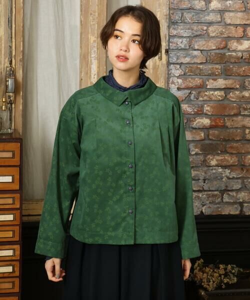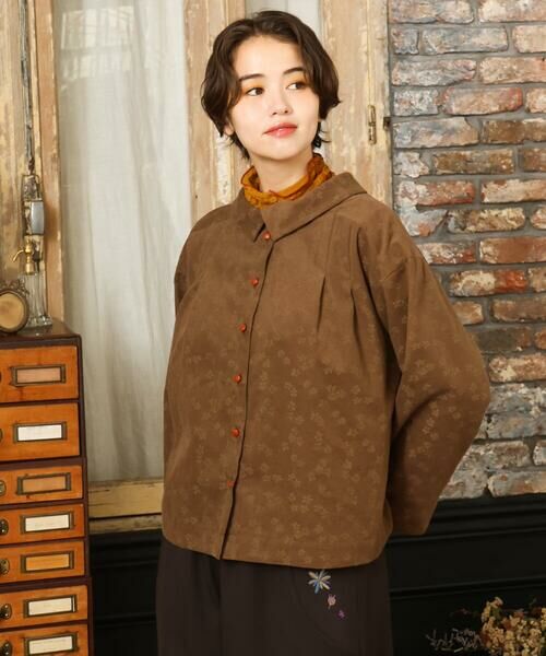 さり気ないお花がポイントのブラウス。前後にあしらったタックで叶うフレアシルエットです。前後2WAY着用可能で、ボタンを前にして羽織りとして、ボタンを後ろにすればロールカラー風の着こなしも楽しめます。袖口を折り返すとなみなみとしたリボンテープが見える仕様に。細部にこだわったブラウスは秋冬のお出かけが楽しくなるひと品です。