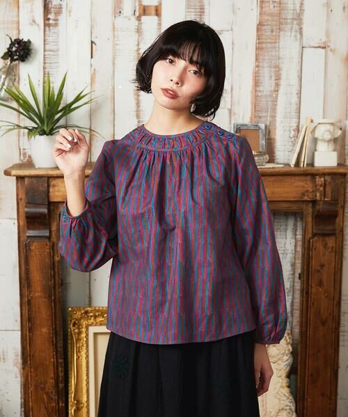 ホコモモラらしい配色感のプルオーバーブラウス。セットインスリーブできちんとした印象ながらも裾がフレアになったフェミニンなシルエットです。ヨーク切り替えでギャザーを寄せた襟元がデザインポイントに。左肩のボタンにも注目。パイピングを施したふんわりとした袖口は女性らしい印象を後押しします。