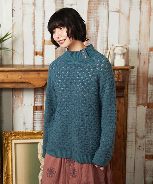 ホコモモラらしい色合いが目を惹くニットプルオーバー。ヒップにかかるくらいの丈感とゆったりシルエットがこなれた印象を後押しします。ほどよい高さのあるネックデザイン。襟ぐりにはブランケットステッチを施し、配色ボタンで着脱可能です。ラグランスリーブは体型を選ばずにお召しいただけます。太さの違う糸を使用し、表現した配色のドット柄でほどよく透け感が出るのもポイントに。