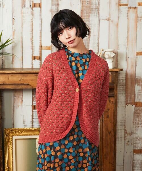 ホコモモラらしい色合いが目を惹くカーディガン。前後に差をつけ、気になる腰回りのカバーも叶うリラクシーなシルエットです。ボレロ風の一つボタンデザインに、ラグランスリーブ仕様で体型を選ばずにお召しいただけるのも嬉しいポイント。首元はVネックですっきりとした印象を後押しします。太さの違う糸を使用し、表現した配色のドット柄でほどよく透け感が出るのもポイントに。カーブした前裾にも注目。