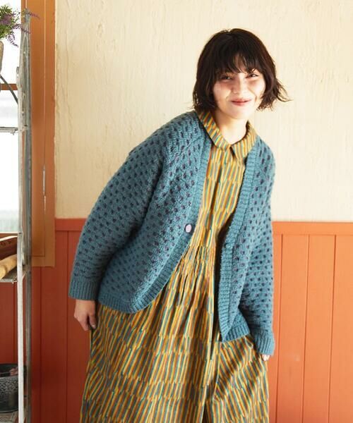主役にもコーディネートのポイントにもなってくれるカーディガン。カーディガンと同色系のアイテムに合わせると全体がまとまったスタイリングが完成します。ホコモモラのワンピースやカットソーと好相性です。