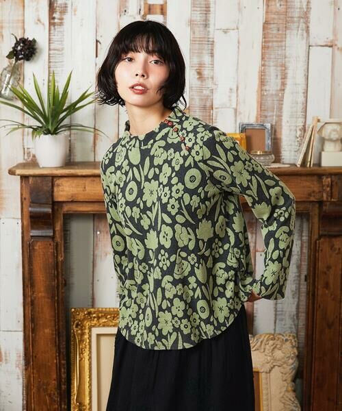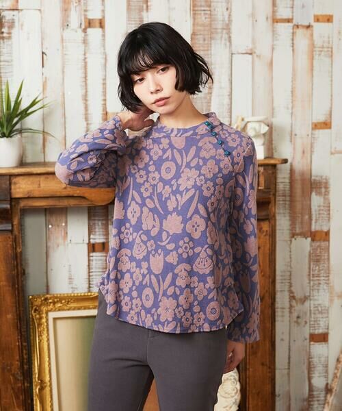 やや起毛した花柄が温かみを感じるカットソー。ゆとりのあるシルエットでリラクシーに、スタンドカラーで顔周りのすっきり見えを叶えます。首元から肩にかけてつけた配色ボタンが目を惹くポイント。裾につまみのタックを入れることで裾をラウンドさせ、シルエットに変化をつけました。