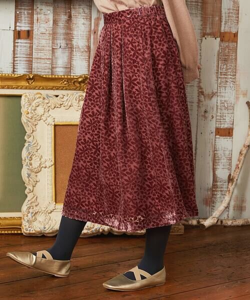 エレガントな雰囲気が楽しめるスカート。柔らかな素材も相まって落ち感がきれいな上品見えのフレアシルエットです。オパール加工を施した同色系のお花柄が魅力。サイドファスナーで着脱できる仕様で、後ろウエストのみゴムにすることで前はすっきりとしながらもリラクシーな着用感も嬉しいポイント。オケージョンシーンにも活躍する優秀スカートです。