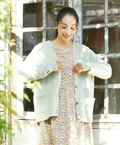 シンプルでベーシックな形のニットカーディガン。インナーとのレイヤードもしやすい、ドロップショルダーのゆったりとしたシルエットです。襟ぐりと前端へシフォン素材を使用して、羽織るだけでこなれ感を演出。袖はすっきりしたシルエットで、もたつかずご着用いただけます。丈感は長すぎず、パンツやスカートとの相性もばっちり。二種類のお花刺繍のくるみボタンがアクセントの、シンプルながらも大人かわいいカーディガンです。