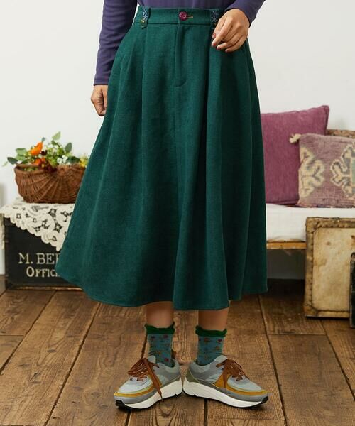 ベーシックで着回し力に優れたスカート。女性らしいフレアシルエットが魅力です。フロントはタックでゆとりを持たせ、バックウエストはゴム仕様で快適な穿き心地を実現。フロントのベルトループに施されたフラワー刺繍がシンプルなデザインのアクセントに。コーディネートしやすい万能スカートはワードローブに揃えておきたいオススメの一枚です。