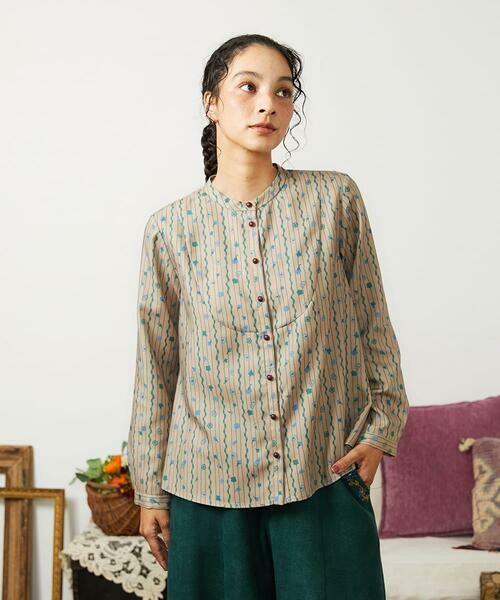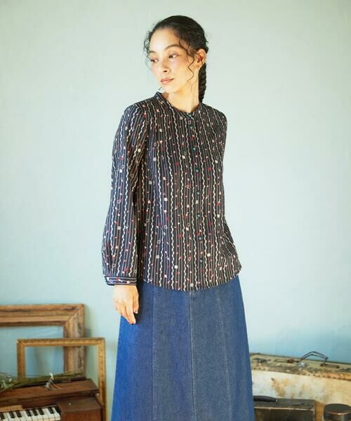 ストライプ×フラワーを組み合わせた柄が目を惹くブラウス。セットインスリーブできちんとした印象に仕上げ、低めのスタンドカラーと丸いヨーク切り替えがポイントに。背中には首元からギャザーを施し、ほどよいゆとりを持たせました。配色ボタンがホコモモラらしい雰囲気を後押し。羽織としても着られる前開き仕様で、インナーとのレイヤードもお楽しみいただけます。