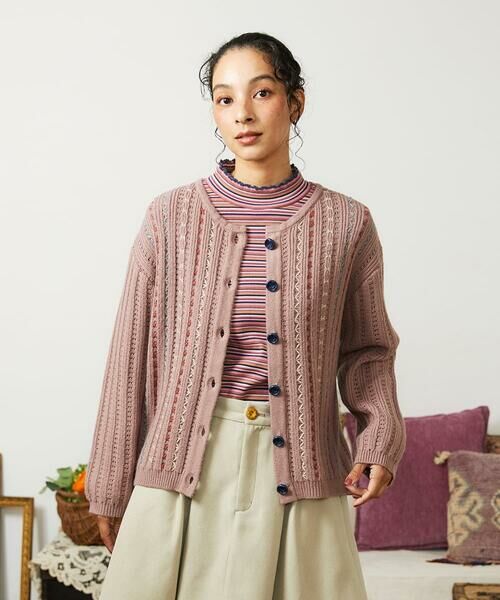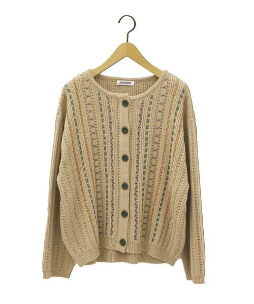 細やかな刺繍が目を惹くニットカーディガン。ストライプ状に透かしの入った柄編みと、縦方向の刺繍を組み合わせました。首元はすっきり見えのクルーネックデザイン。刺繍がフロント全面に施されており、大人かわいい印象になります。裾はやや丸みを帯びたシルエットで、女性らしい雰囲気を後押し。お花の刻みが入ったボタンもポイントに。ボタンを閉じてプルオーバーのように着ても、羽織としても使える万能なカーディガンです。