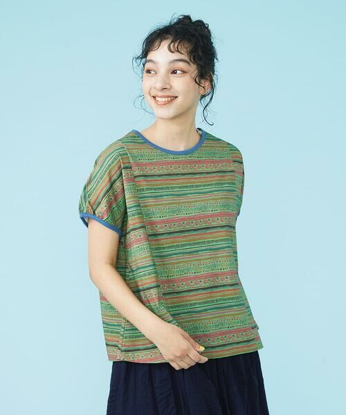 様々な形で構成されたボーダー調の柄をプリントしたカットソー。