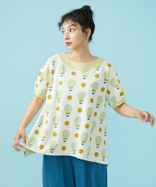 気球とドット模様が特徴のカットソー。テーマの「Paseo en globe」(気球に乗って)からインスピレーションを受けたアイテムです。夏場に嬉しい風通しの良いゆったりとしたリラクシーなシルエットで体型カバーも出来る優秀アイテム。Aラインで裾に向かいさらに広がりを持たせ、サイドに長さを出すことで動きのある軽やかな印象を演出してくれます。袖口のタックで丸みを帯びた袖のシルエットが女性らしさを後押しするポイントに。襟ぐりと袖の無地配色切り替えがアクセントになりすっきりと引き締め効果も期待できます。後ろ襟ぐりのホコモモラらしい配色ボタンもポイント。お出かけ着としてはもちろん、おうちでのリラックスタイムにもおすすめの気負わずにおしゃれを楽しめる一枚です。