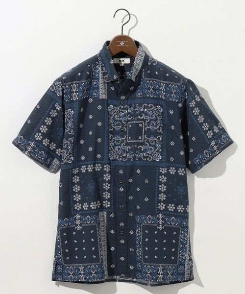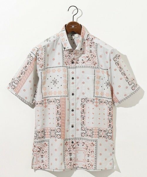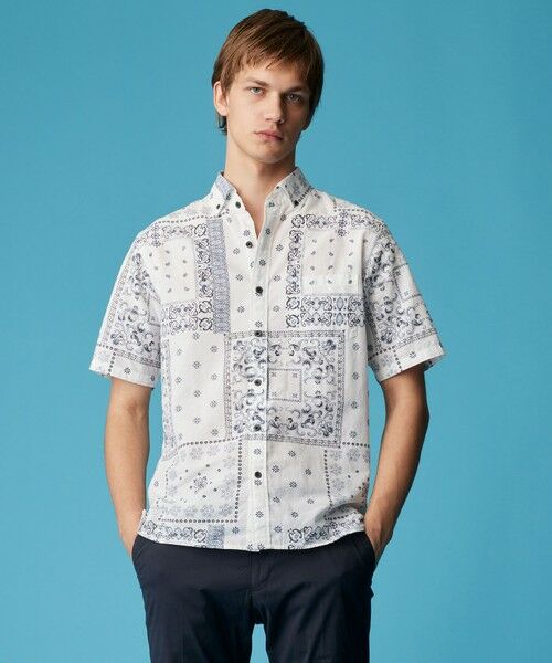 ■デザインコード糸を使用した組織間のある基布に華やかなフラワーモチーフを表現。バンダナ柄のプリントシャツはスタイリングのアクセントになり、羽織としても使える汎用性の高いアイテムです。衿デザインはボタンダウンカラー。