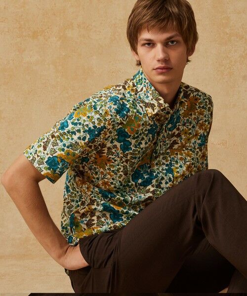 英国リバティ社の伝統的なプリント柄を全面にあしらい、華やかさと上品さを両立。背面はダーツやタックを取り外したシンプルなデザインで、柄の魅力を際立たせています。セミワイドのフライポイントカラーは、顔まわりをすっきり見せつつ、カジュアルにもきれいめにも合わせやすいバランスの良い衿型です。