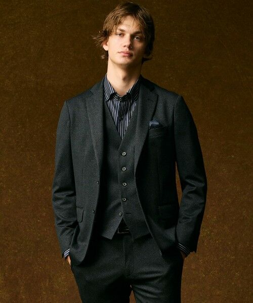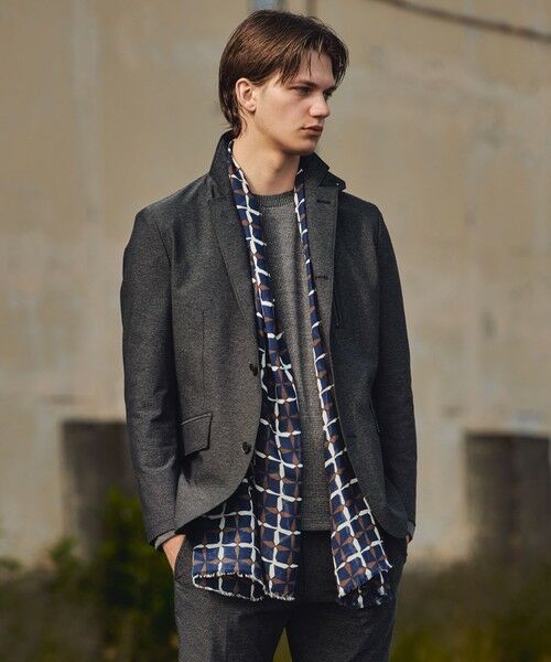 シンプルな2ボタンテーラードデザインに機能性をプラス胸ポケットの袋布がポケットチーフになる【ギミックチーフ】仕様を搭載。ジャケット裏地のオリジナルプリント柄と連動したカラークロスもデザインポイントです。