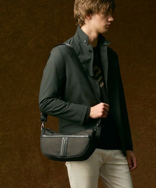 形状記憶インターレースジャガード素材撥水・防風機能付きの軽量生地シュリンク&オイルドレザーのコンビ使い収納力のあるコンパクト横型デザイン