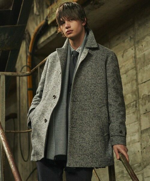 襟の形を変えられるコンバーチブル型のステンカラーコートです。やや大柄に表現されたヘリンボン柄が、装いに奥行きと洗練された印象を与えます。胴裏にはJOSEPH ABBOUDオリジナルのキュプラジャガード裏地を、ボタンにはアンティーク調の水牛釦を使用し、細部にまで高級感を追求しました。ビジネスシーンからラグジュアリーなカジュアルシーンまで、幅広い着こなしに対応する汎用性の高い一着です。