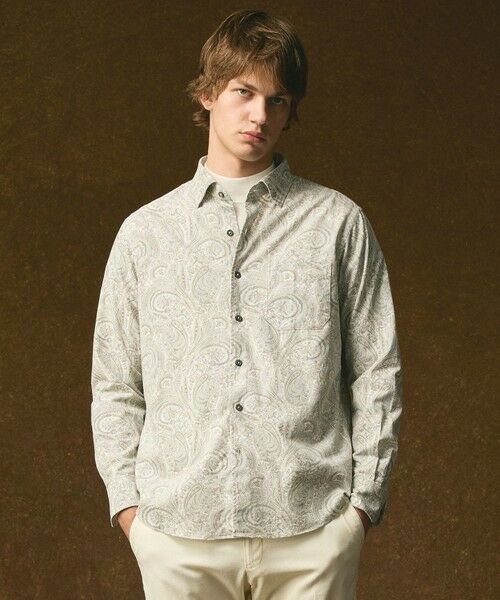 英国リバティ社の伝統的なペイズリー柄を、落ち着いた配色で表現しました。柄にインパクトがありながらも、大人のスタイルに自然と溶け込む上品な仕上がりです。衿元にはフライポイントカラーを採用し、クラシックな印象の中にシャープさをプラスしています。