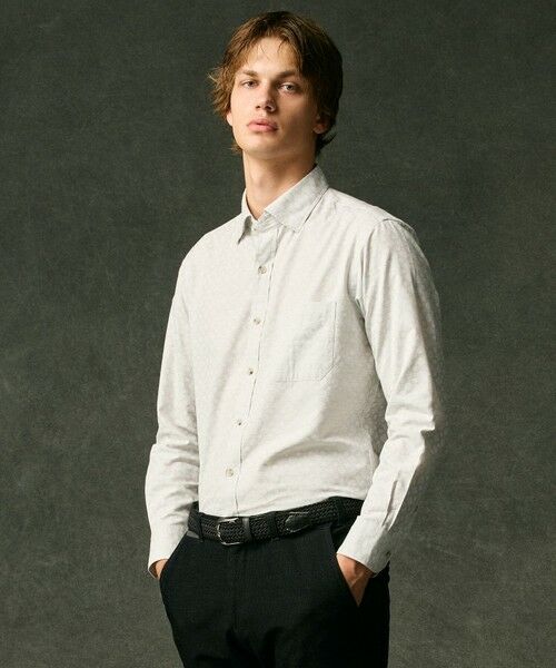 全面にプリントされた繊細な小紋柄が、和洋折衷の上品な雰囲気を醸し出します。落ち着いた色合いのため、柄物ながらも派手にならず、大人の装いに自然と溶け込みます。衿元はフライポイントカラーを採用し、クラシカルな印象の中にシャープさをプラス。さらに製品洗いを施すことで、着始めからこなれた自然な風合いとリラックス感をお楽しみいただけます。