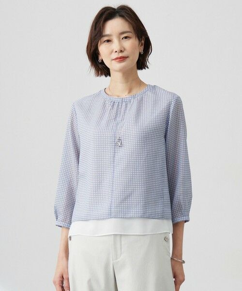幾何柄のような見え感のオリジナルチェック柄カットソー。裾にシアー素材を重ねたデザインで、シアー部分は合わせるボトムスに合わせてアウトでもインでもお使いいただけます。身頃のみジャージ素材で2枚重ねになっているためインナーが透ける心配もなく、肌触りの良いジャージ素材を使用しているため着心地が快適なのも嬉しいポイント。前襟のホックは開けても閉めても着用でき、ジャケットインナーとしても活躍する1枚です。