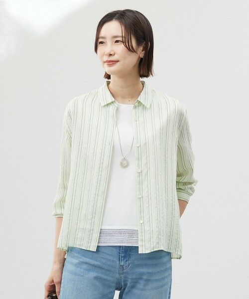 ■デザインランダムなストライプの涼し気なシアーシャツ。ほどよくゆとりがあるテントシルエットで、肌に張り付かずふわっと着ていただけます。気温に合わせてインナーを変えたり、前を開けて羽織としてもお使いいただけるスタイリングを楽しめるアイテムです。1枚羽織るだけで春夏らしさをプラスできるデザインで、休日のお出かけからオフィスシーンまで幅広く活躍します。