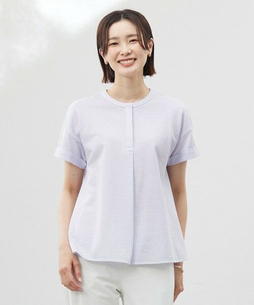 ■デザイン前立てが比翼仕立てになった、ブラウス風の長めフレンチスリーブカットソー。柔らかなAラインフレアが美しく、袖口から裾へ流れるパネルラインがバイヤス技法で洗練された表情を醸し出し、デザインに深みを与えています。丈感はワイドパンツや細身パンツにも合わせやすく、幅広い着こなしを楽しめます。二の腕が隠れる袖丈なのもうれしいポイント。涼しげなストライプ柄が夏スタイルのアクセントとなり、全体のコーディネートを一気に格上げするアイテムです。