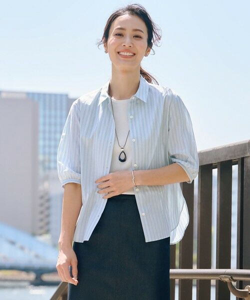 ■デザインボリュームのある袖がポイントの5分袖シャツブラウス。ベーシックなシャツカラーとすっきりとしたストレートシルエットに、袖山のタックや袖口の細めのカフスが程よい立体感のある1着です。気になる二の腕をさりげなくカバーしてくれる、肘が隠れる5分袖も嬉しいポイントです。シンプルで華やかさのある大人にぴったりなブラウスに仕上げました。カラーは、清潔感のあるホワイト(#101)、女性らしさを引き立てるピンク(#112)、爽やかなアクセントになるアクアグリーン(#161)、大人な雰囲気のネイビー(#175)の4色展開。