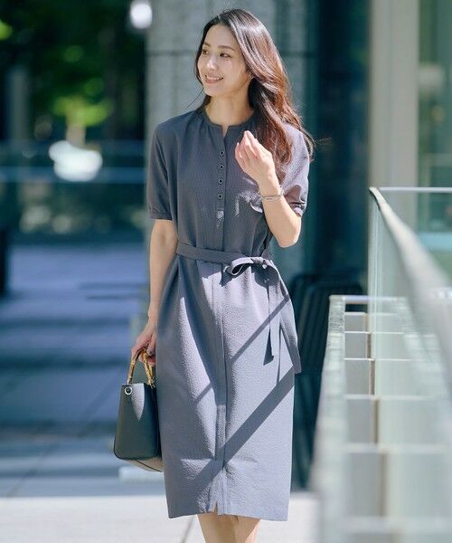 ■デザイン首元が涼しげな、キーネックデザインのワンピース。前立ての上部には、縁がメタルの釦をあしらい、シンプルながらも華やかなアクセントにしています。途中から比翼デザインになっており、すっきりとした仕上がりに。襟元のギャザーに、程よい分量感を持たせています。袖は二の腕が隠れる安心感のある丈感で、袖口にはギャザーを入れてほんのりふんわりとさせました。共布リボン付きで、ウエストを絞ることでメリハリのあるスタイルにアレンジが可能です。裏地は付けず、見た目も着心地も涼しげに仕上げました。カラーは、爽やかで落ち着きのある印象を与えるスレート(#004)、こなれ感のあるモカ(#030)、着回しやすい大人なネイビー(#075)の3色展開。