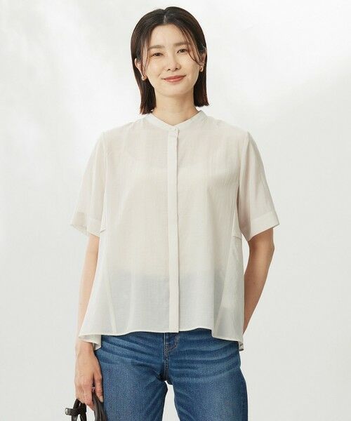 ■デザイン軽やかさが魅力のバンドカラーと、後ろ姿が魅力的なバックフリルがポイントのブラウス。後ろ身頃にたっぷりと分量を取ったフレアが、動く度にふわりと揺れる姿が印象的です。大胆なバックフリルデザインながらも、生地の軽やかさで着心地はとても快適です。袖は二の腕をさりげなくカバーする丈感で、気になる部分を自然に隠してくれるのも嬉しいポイントです。ワイドパンツと合わせて抜け感のある着こなしや、細身パンツやナロースカートと合わせるのもおすすめ。裏地は付けず、涼しげに仕上げました。カラーは、柔らかく穏やかな印象のモカ(#030)、肌なじみの良い上品なライトベージュ(#033)、清涼感とニュアンスを兼ね備えたスモーキーミント(#062)、爽やかで知的な印象のブルー(#070)の4色展開。