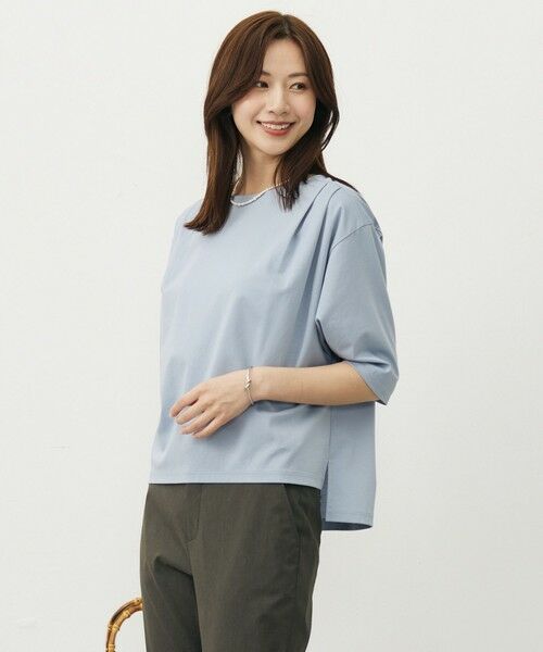 ■デザイン肩に寄せたタックがさりげないアクセントになった、ゆとりあるシルエットのボートネックカットソー。空気をはらむような軽やかなシルエットで、暑い季節にも心地よく着られます。首元はすっきりと見せつつ、上品な印象のボートネックに仕上げました。カジュアル過ぎない大人の抜け感のある1枚は、パンツにもスカートにもバランスよく合わせられ、デイリーに活躍します。カラーは、シックで大人な印象のスレート (#004)、シーンレスに活躍するブラック(#005)、柔らかく女性らしいライトベージュ(#033)、爽やかで凛とした印象のサックス(#073)の4色展開。
